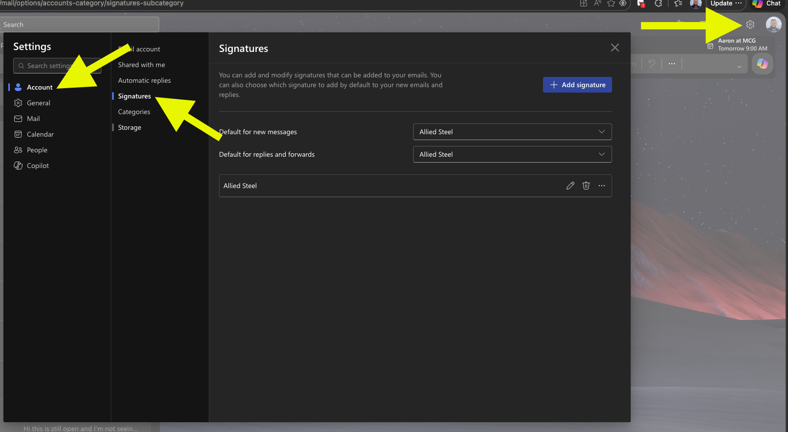 - Select “Account” → “Signatures”