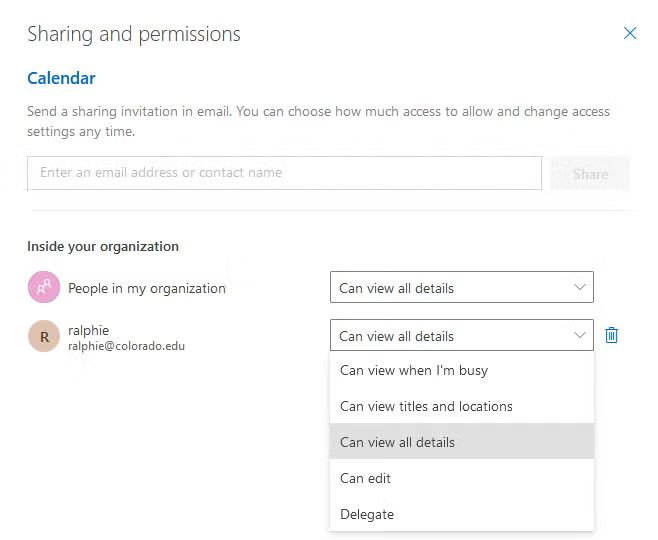 - Use “Can view when I’m busy” for most internal users